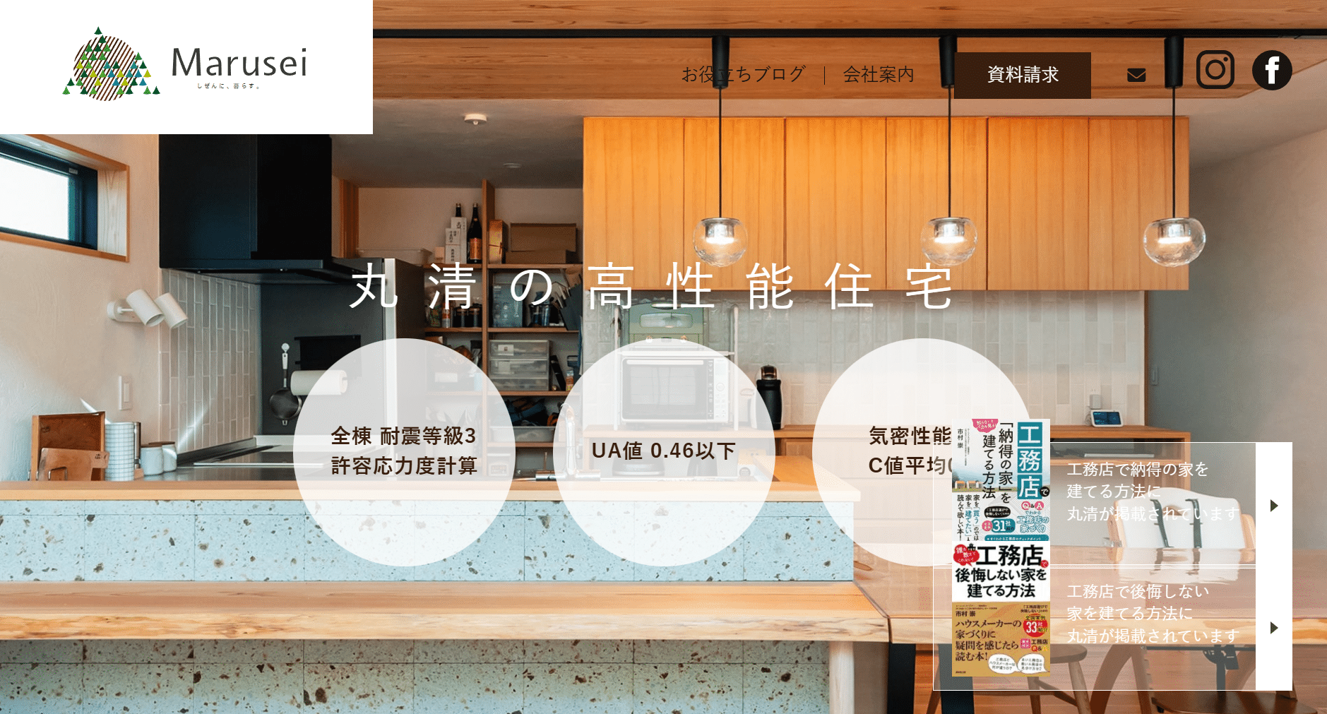 私たち丸清は、天竜材を使った高性能な木の家を坪単価65万円で建てています。耐震等級3、UA値0.46以下(HEAT20 G2レベル)、気密性能C値0.6という高い性能を標準仕様で実現しながら、この価格を可能にしています。