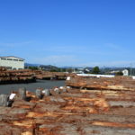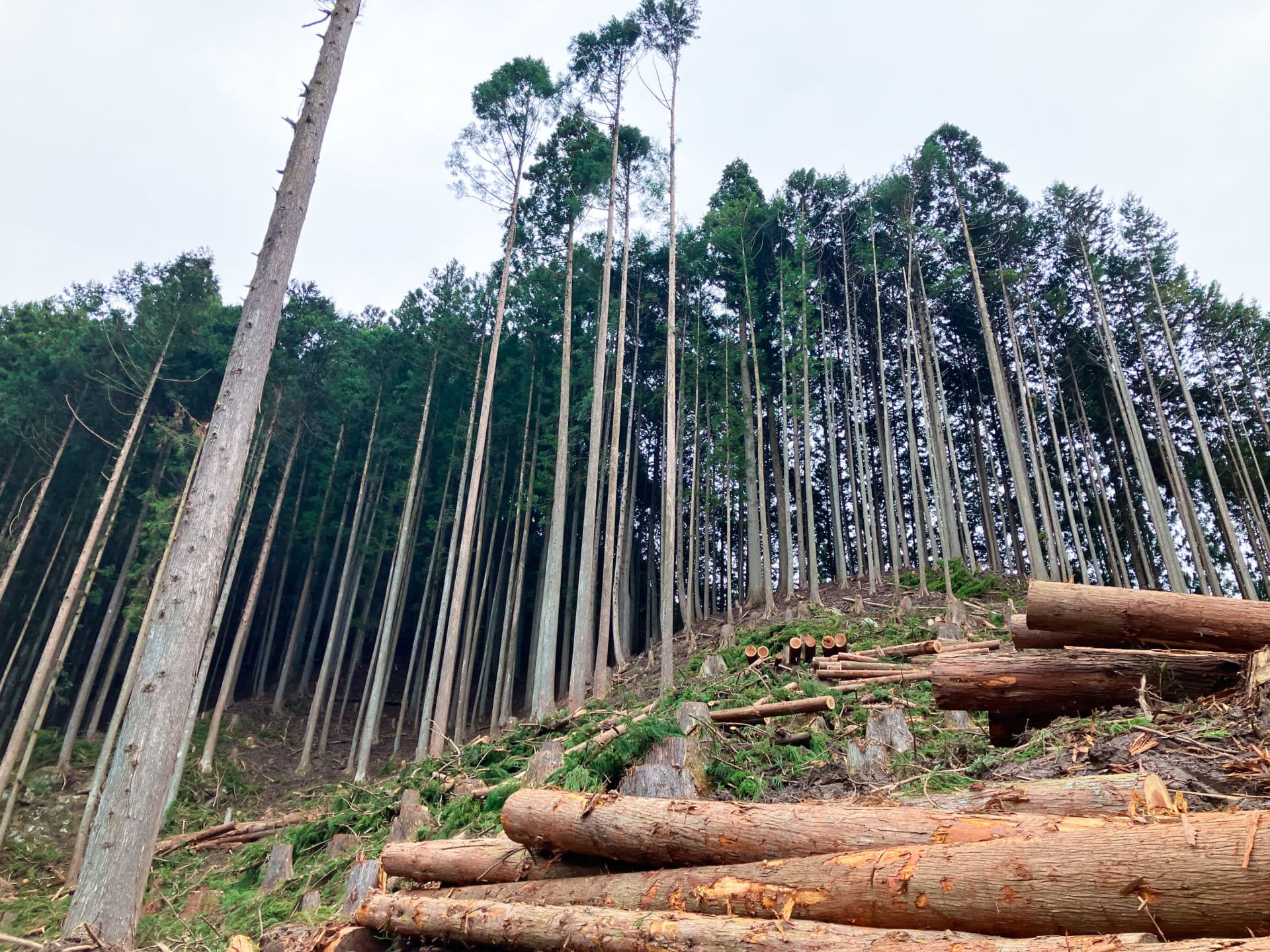 日本三大美林の一つ、天竜材を扱う原木市場。天竜の高品質な杉、ヒノキが椪積しています。